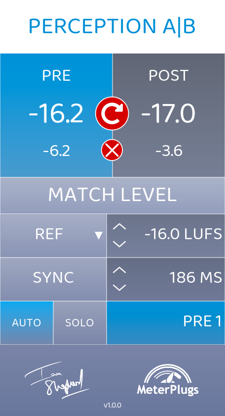 Perception AB solves this problem by automatically compensating for differences in loudness, for any processing chain. Simply click “Match Level” and the Pre and Post levels are balanced and ready to preview in realtime, with full latency compensation, even for external analog hardware. “Ever since we released it people have been asking us to bring that same powerful perspective to mixing, as well as mastering. Perception AB does that,” says Ian Kerr of MeterPlugs.